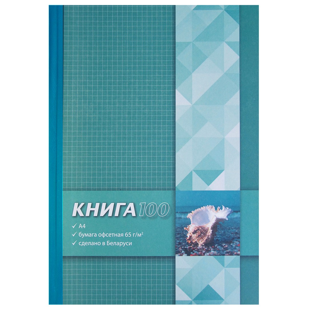 Книга канцелярская А4 формата, 100 листов, в твердом переплете, внутренний блок — офсетная бумага в клетку, скреплена с помощью склейки и скоб.