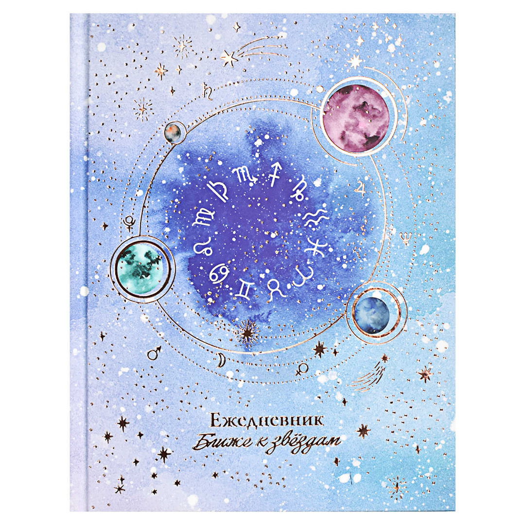 Ежедневник астрологический «Ближе к звездам» с тиснением фольгой и матовой ламинацией содержит информацию о лунных циклах и знаках зодиака.