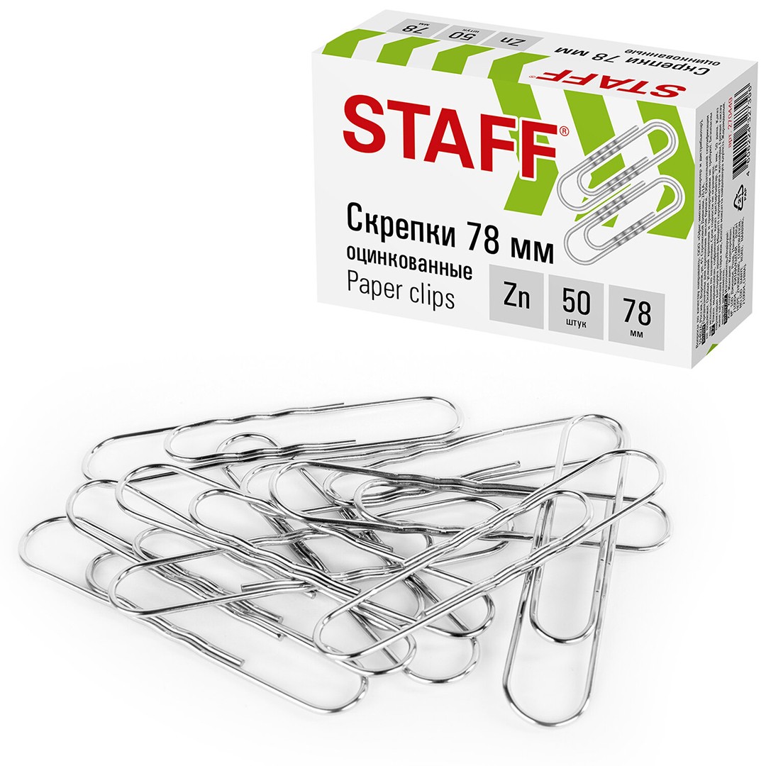 Большие канцелярские скрепки длиной 78 мм, имеют классическую овальную форму и цинковое покрытие, не окисляются и не повреждают документы.