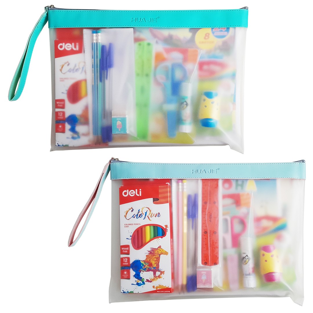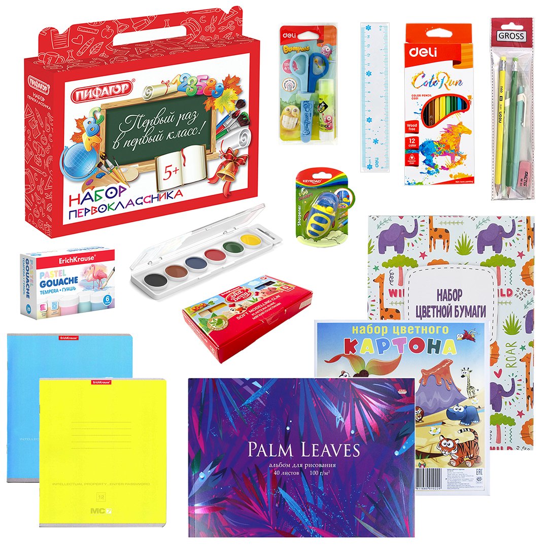 Набор канцелярских принадлежностей для будущих первоклассников Подарок первокласснику-11 из 14 предметов обойдется вам дешевле на 10%.В набор входит: папка на молнии, альбом для рисования, бумага цветная, картон цветной, карандаши 12 цветов, ножницы, карандаши чернографитные, ручки шариковые, линейка, точилка, клей карандаш, ластик.В наборе покупать выгоднее!