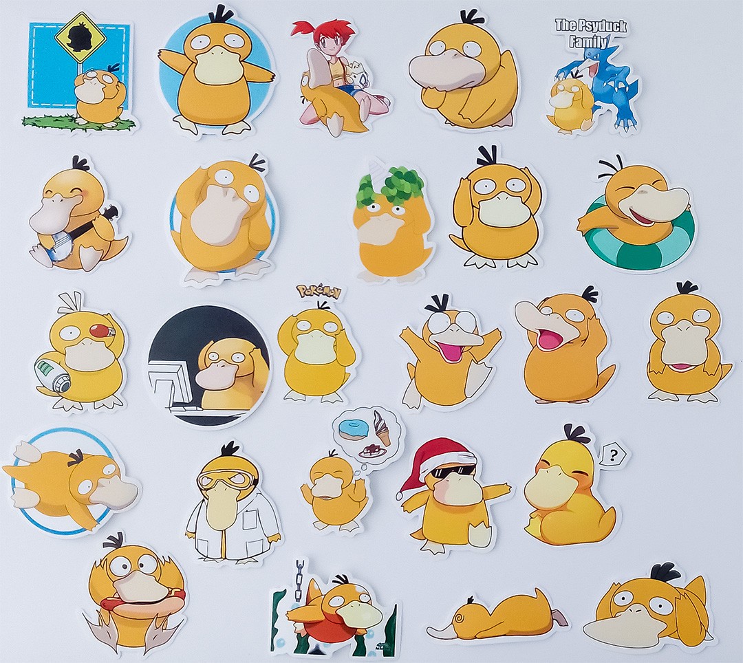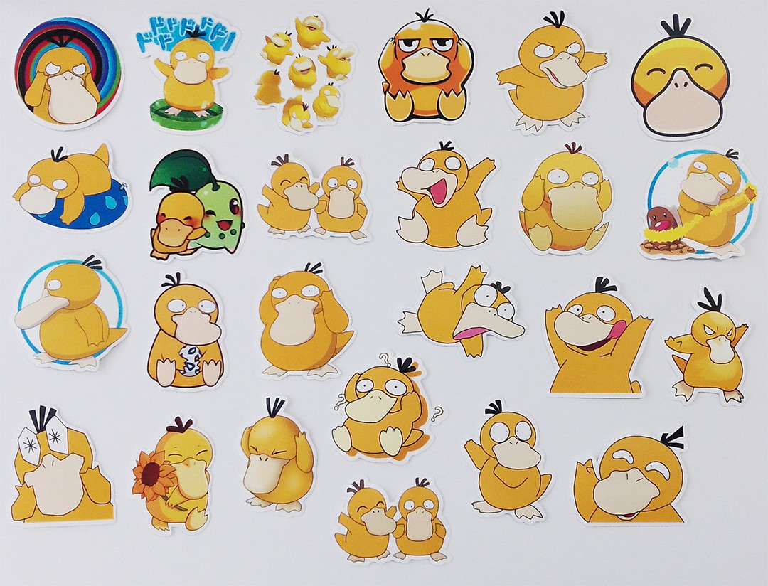 Набор наклеек (суперстикеров) Утка-2 из популярной медиафраншизы «Покемон» (компьютерные, мобильные, карточные игры; аниме), (25 шт в упаковке), самоклеящихся, многоразовых, водостойких, используется для размещения на любой гладкой поверхности.
