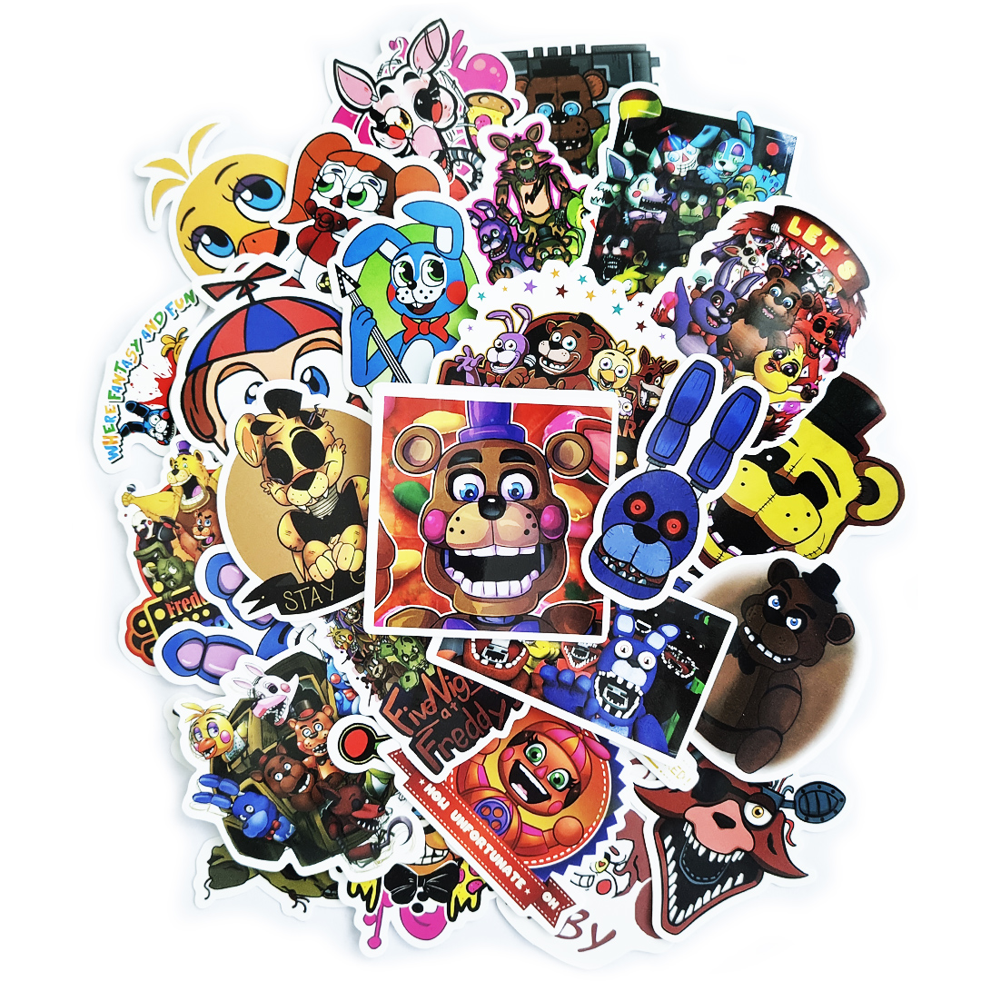 Набор наклеек (суперстикеров) с изображением героев серии компьютерных видеоигр «Пять ночей „У Фредди“» (50 шт в упаковке) самоклеящихся, многоразовых, водостойких, используется для размещения на любой гладкой поверхности.