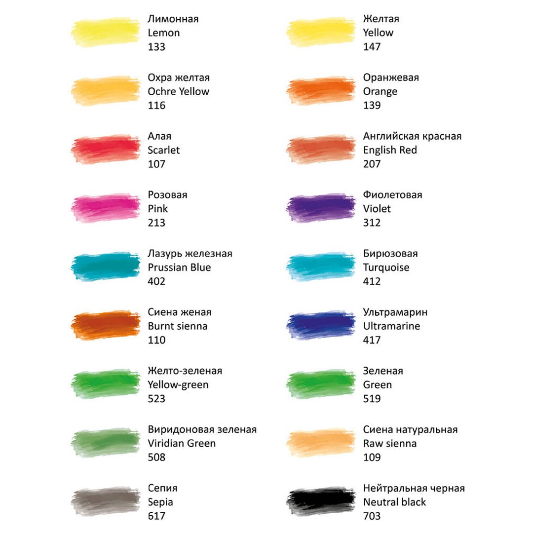 Цвета: Лимонная, Желтая, Охра желтая, Оранжево-желтая, Алая, Индийская красная, Красно-фиолетовая, Фиолетовая, Лазурная, Бирюзовая, Голубая, Ультрамарин, Желто-зеленая, Изумрудная зеленая, Виридоновая зеленая, Сиена натуральная, Умбра жженая, Нейтральная черная.