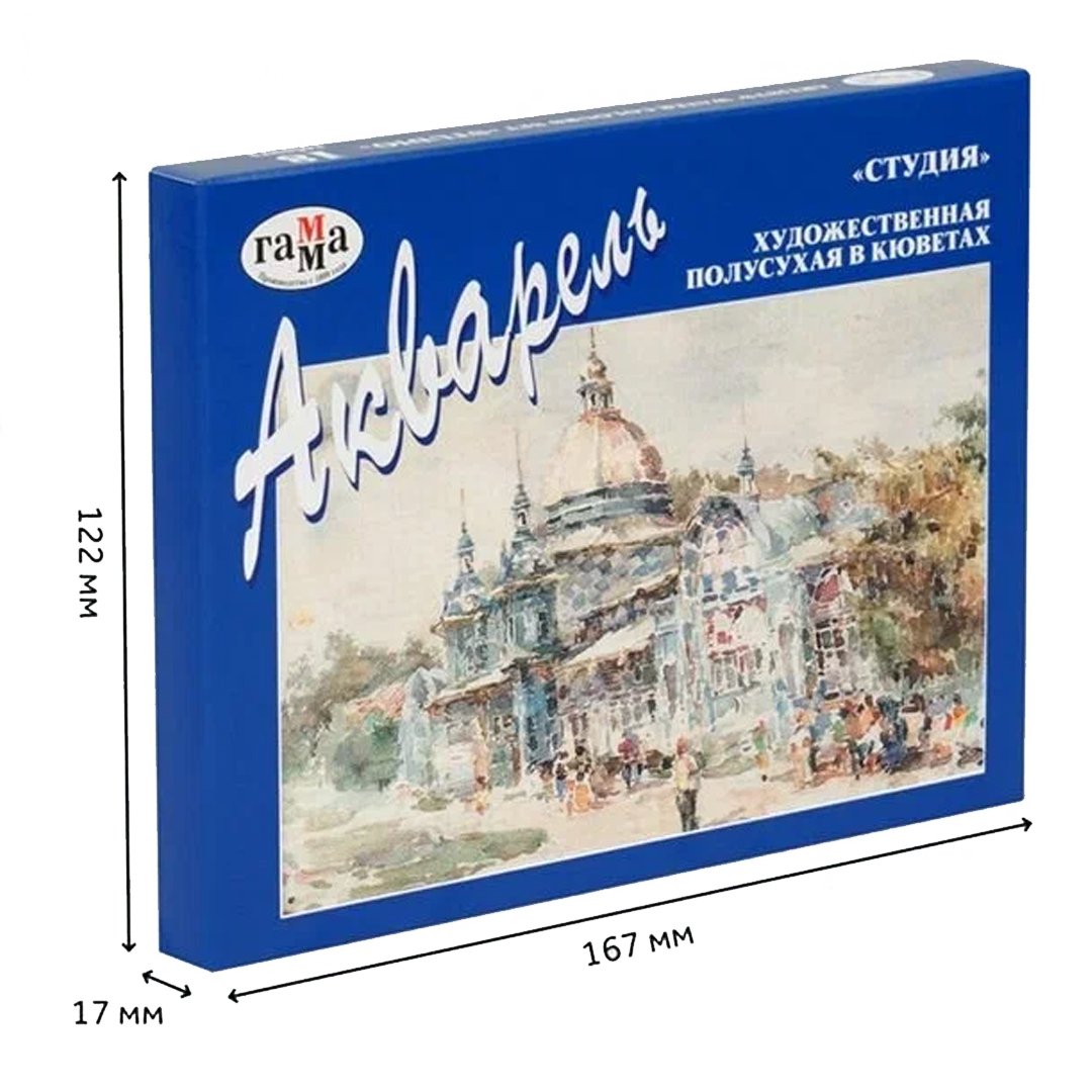 Акварель художественная Гамма «Студия» полусухая в кюветах 18 цветов/2,6 мл, предназначена для живописи, обладает интенсивностью и чистотой цвета.