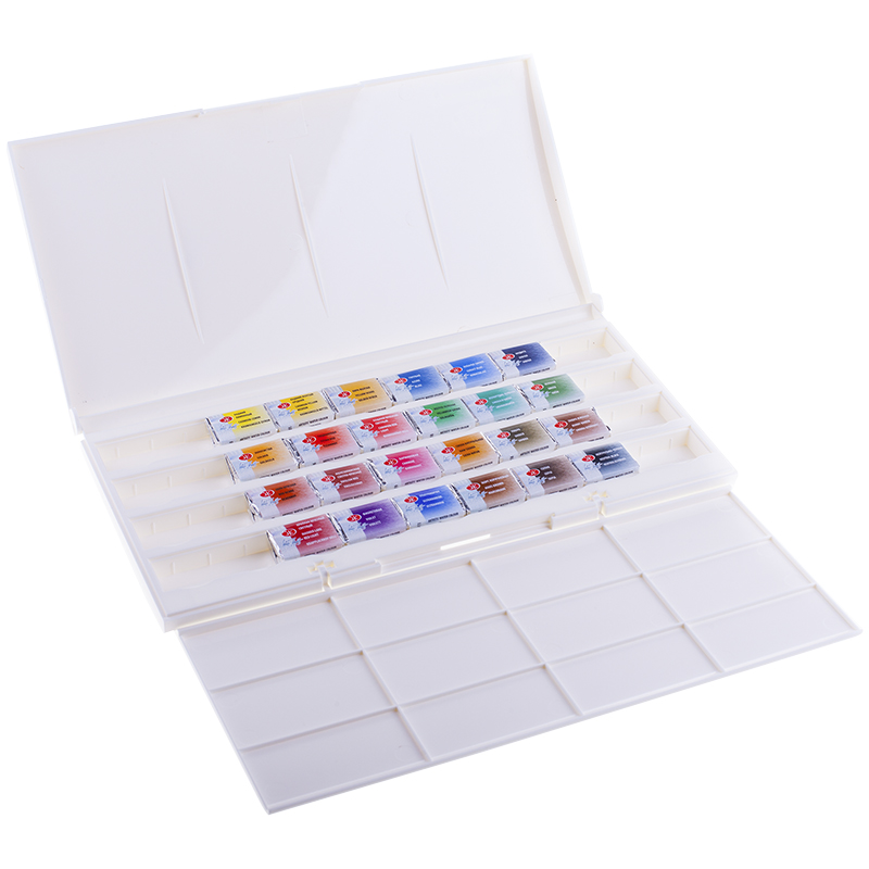 Цвета в наборе: Кадмий лимонный, Кадмий желтый средний, Охра желтая, Золотистая, Тициановая или Лак оранжевый, Кадмий красный светлый, Охра красная, Железоокисная светло-красная, Карминовая, Краплак красный светлый, Фиолетовая, Ультрамарин, Голубая, Кобальт синий, Индиго, Желто-зеленая, Изумрудно-зеленая, Зеленая, Сиена натуральная, Умбра, Умбра жженая, Марс коричневый, Сепия, Нетрально-черная.