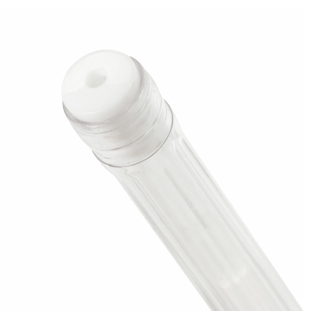 Гелевая ручка с прозрачным шестигранным корпусом и рифлением для удобства письма, исключающим скольжение пальцев.