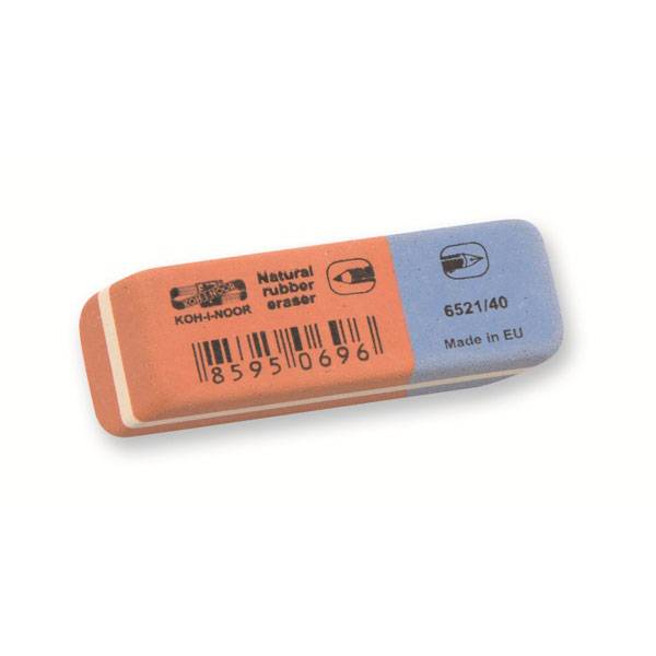 Большой (как 3 обычных), комбинированный ластик из натурального каучука. Красная сторона — для мягких графитовых карандашей, синяя сторона — для цветных и твердых графитовых карандашей, а также чернил и шариковых ручек. При стирании не повреждает бумагу, не оставляет грязных следов.