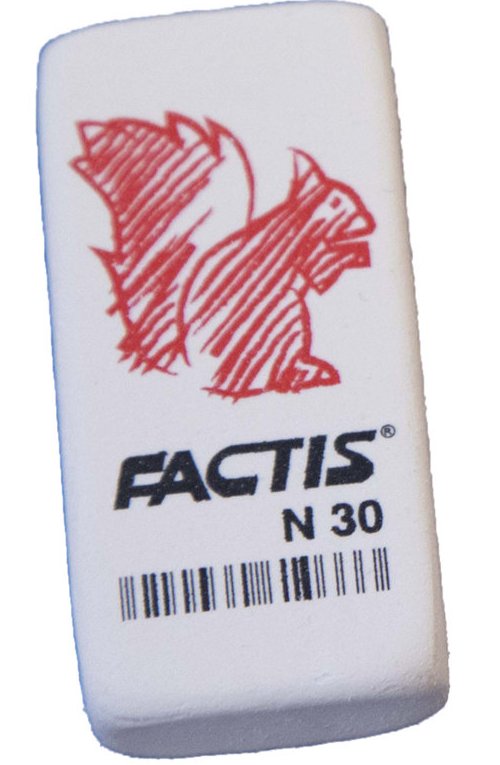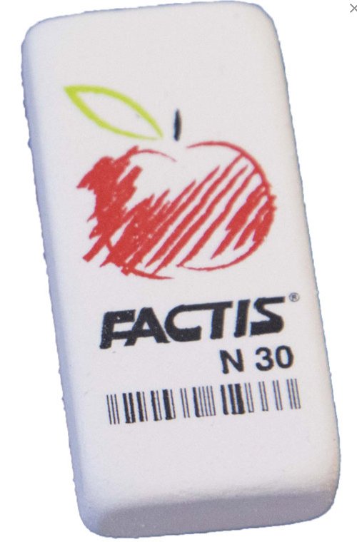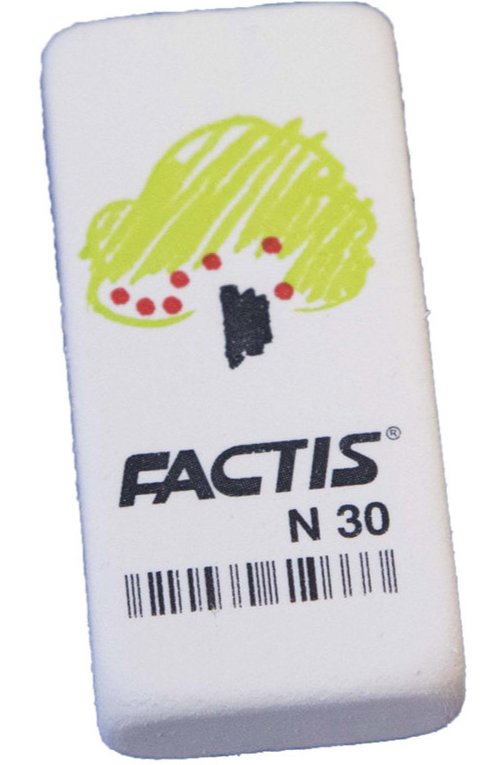 Большой (как 2 обычных), мягкий, гибкий ластик FACTIS N30 из синтетического каучука, отлично подходит для удаления надписей, сделанных чернографитным карандашом.