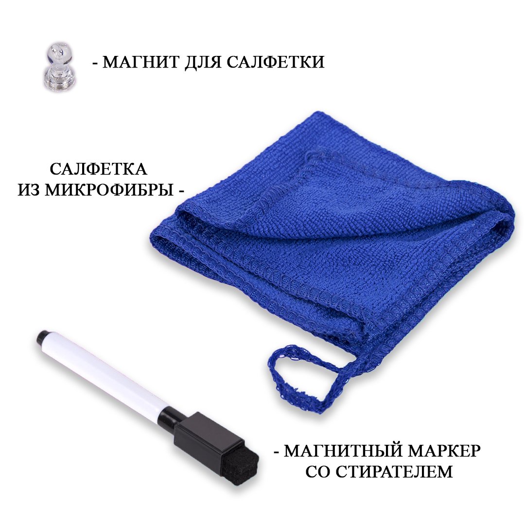 В комплекте: черный маркер для белых досок с магнитом и стирателем в колпачке, салфетка из микрофибры (с «ушком» для подвешивания) и магнит специальной формы, удобной для подвешивания салфетки.