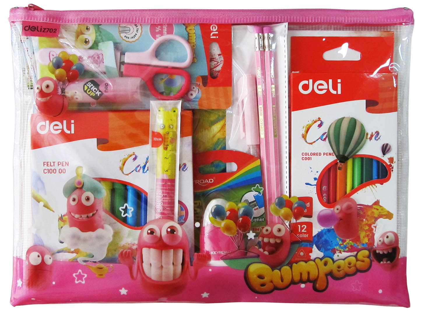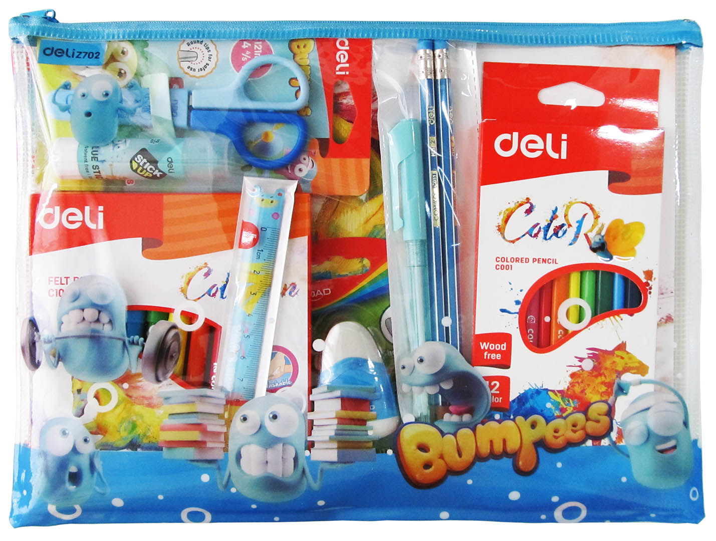 В набор входит: папка на молнии А4, альбом для рисования 40 листов, фломастеры 12 цветов, карандаши 12 цветов, ножницы, карандаш чернографитный 2 шт., ручка шариковая 1 шт., линейка, точилка с ластиком, клей карандаш 8 гр.