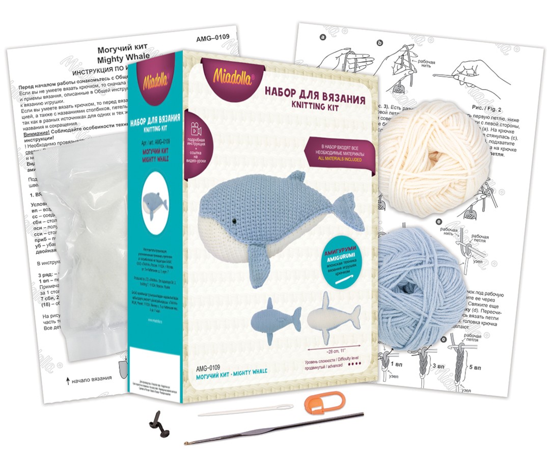 Набор для вязания Miadolla «Могучий кит» содержит все необходимые материалы для изготовления игрушки в популярной японской технике амигуруми.