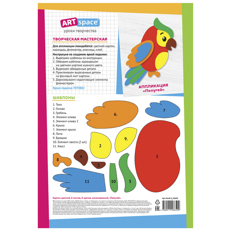 Картон цветной А4, 8 цветов, 8 л., «Попугай» — этот товар можно заказать оптом и в розницу с доставкой по Беларуси на сайте M4,