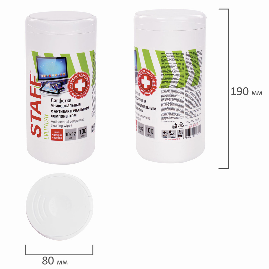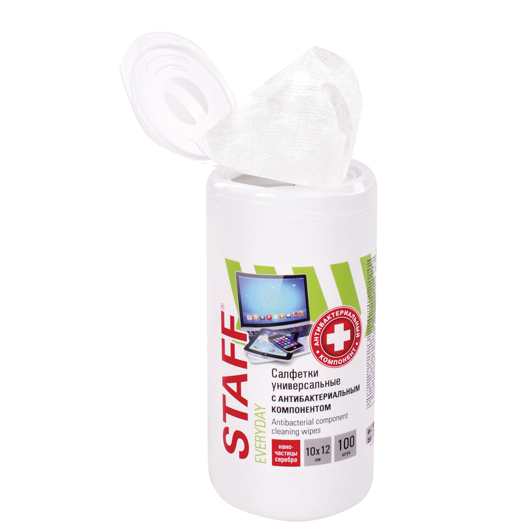 Чистящие влажные салфетки STAFF с антибактериальным компонентом предназначены для очистки и дезинфекции (обеззараживания), удаления пыли и загрязнений с бытовой и офисной техники.