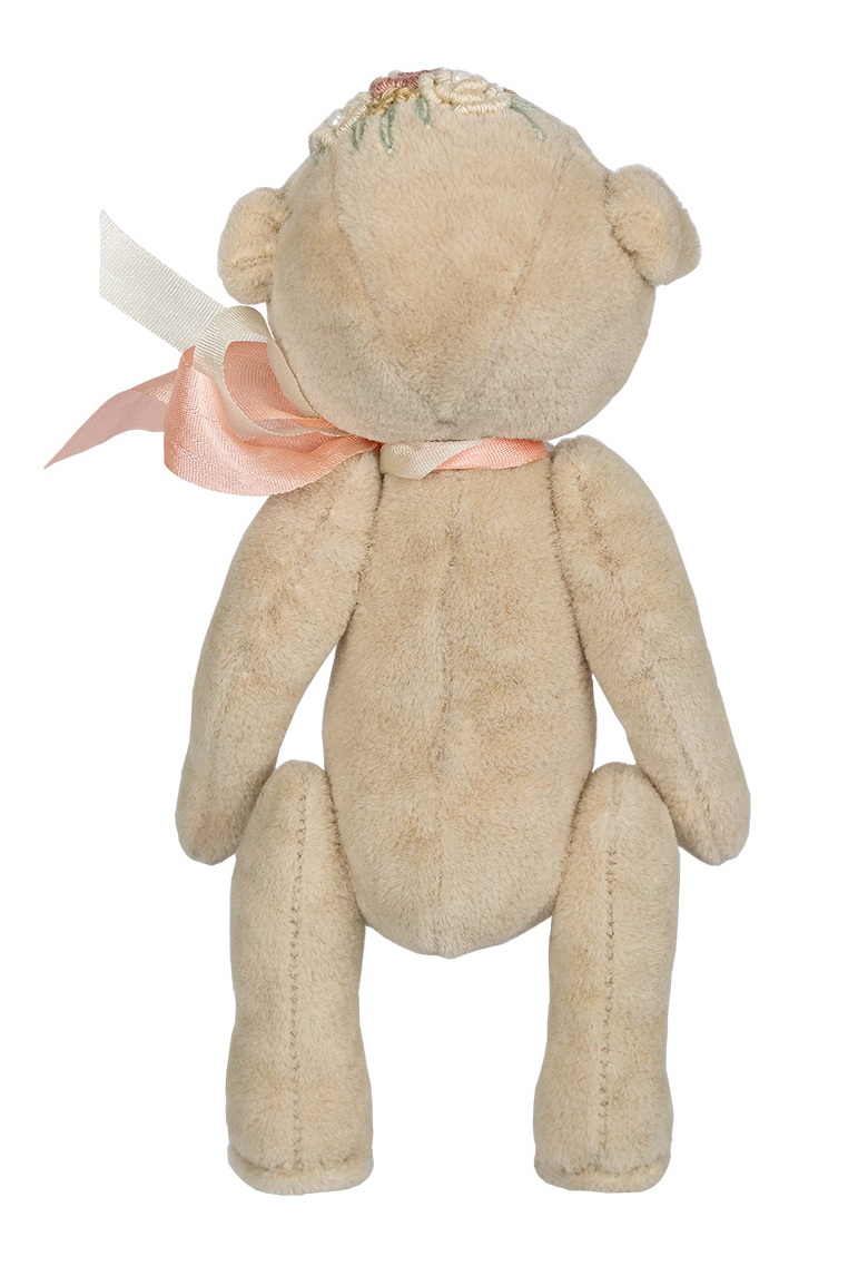 Миниатюрная игрушка украшена цветочной вышивкой и бантом из шелковых лент.