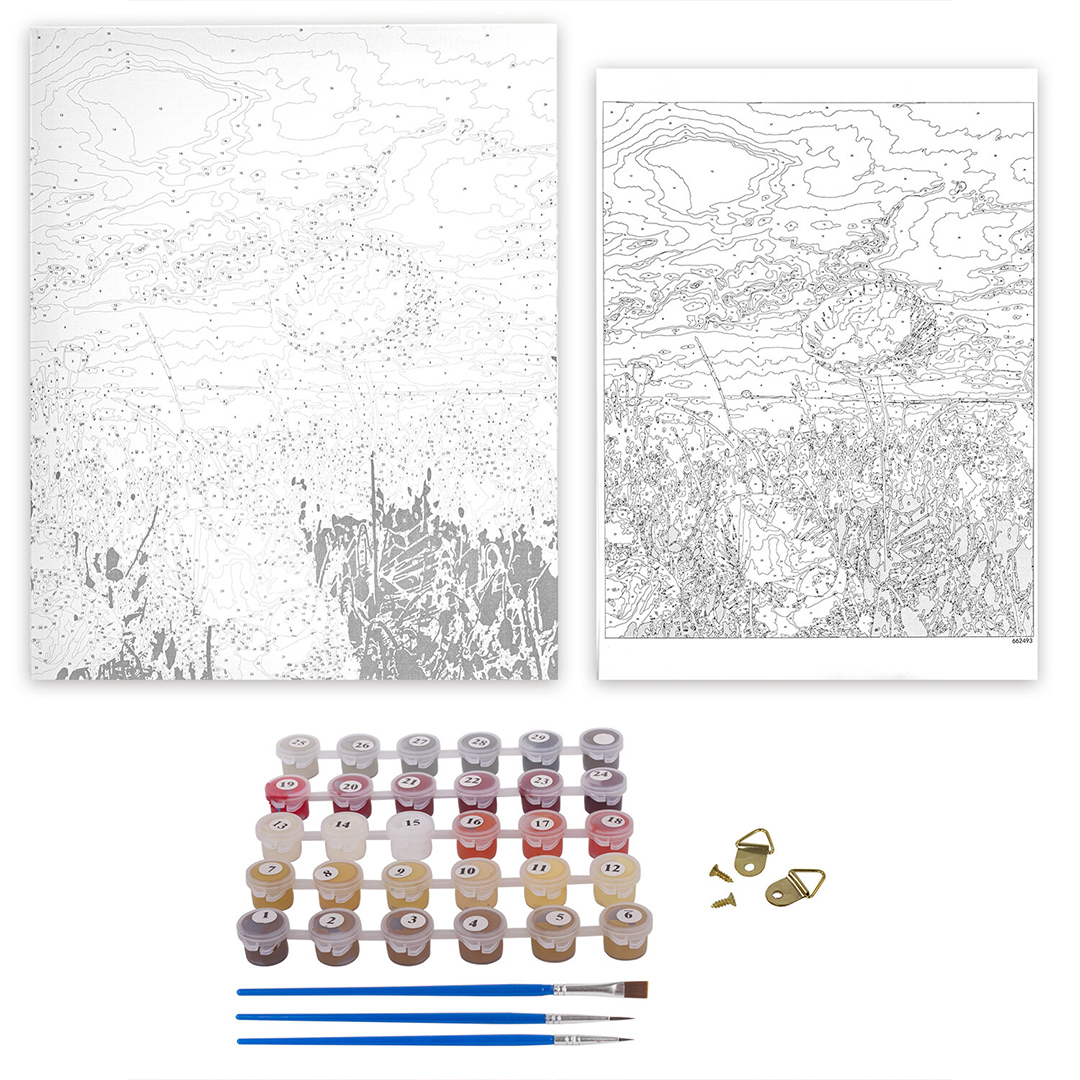 В набор входит: 1 хлопковый холст на подрамнике с контуром, 1 лист бумаги для тренировки, 30 акриловых красок объемом 3 мл каждая, 3 синтетические кисти и комплект металлических креплений для подвешивания на стену.