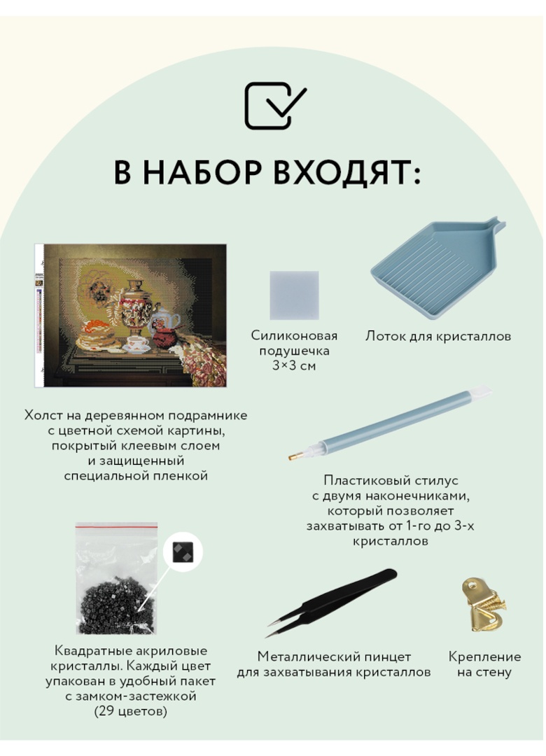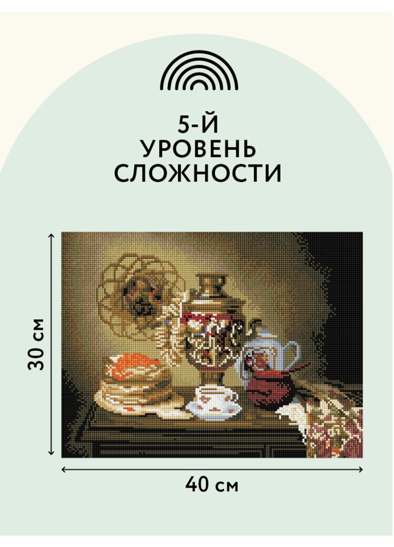 холст 30×40 см на деревянном подрамнике с цветной схемой картины, покрытый клеевым слоем и защищенный специальной пленкой;