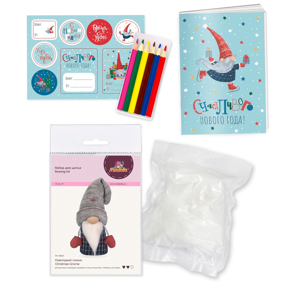 В подарочный новогодний бокс входят: набор для шитья игрушки Miadolla NY—0321 Новогодний ангел, наполнитель для игрушки синтепух «Gamma», цветные карандаши, блокнот и цветные наклейки.