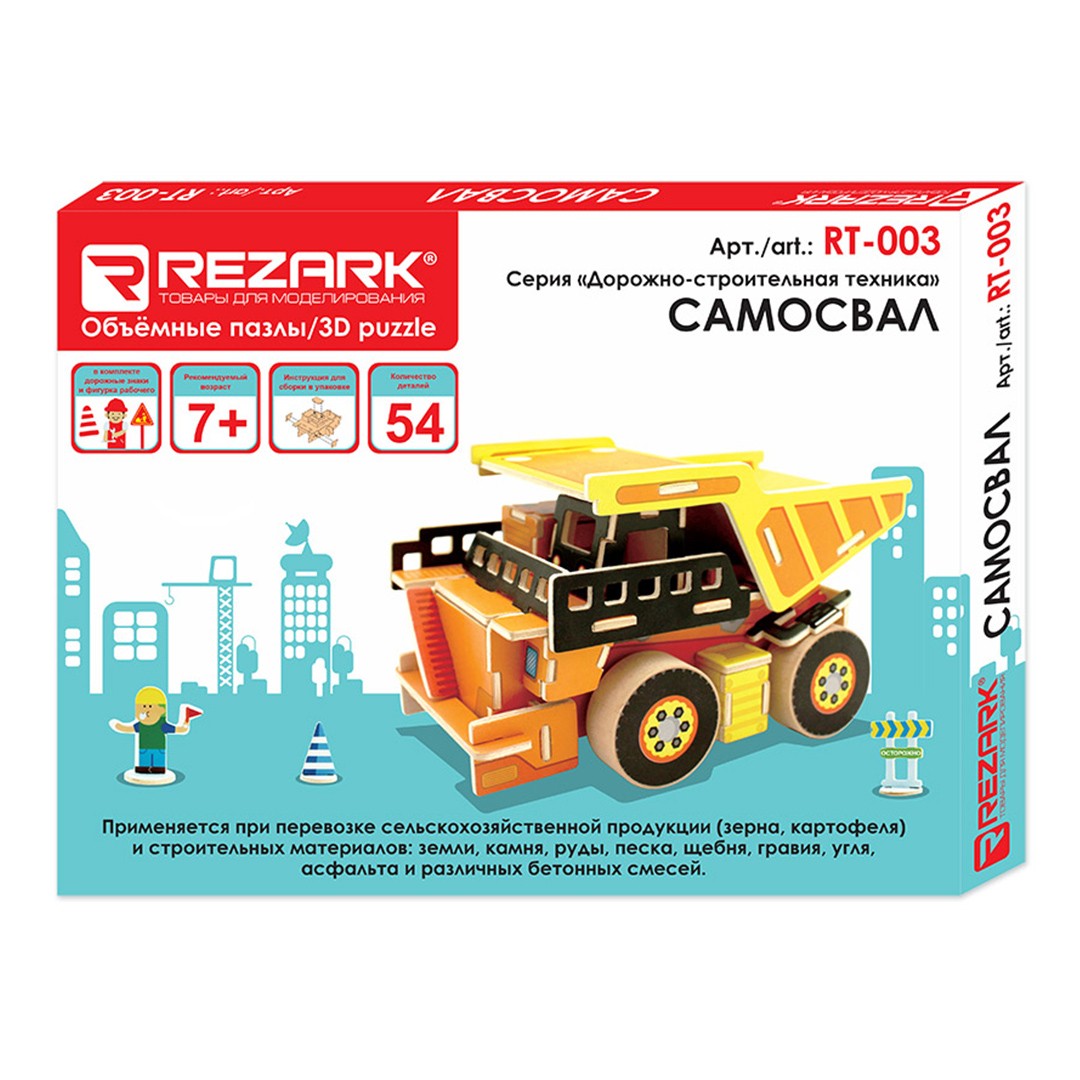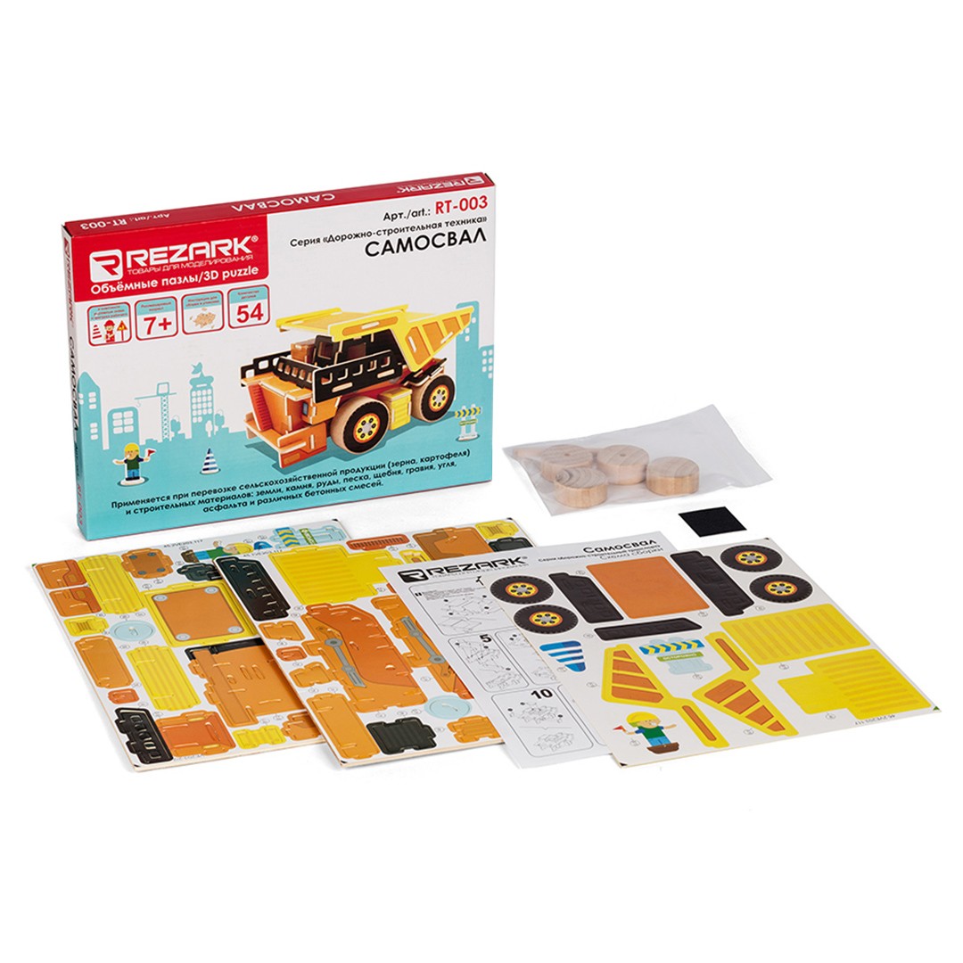 Детский развивающий пазл Rezark «Самосвал» серии «Дорожно-строительная техника» представляет собой сборную 3D модель из фанерных деталей с самоклеящимися наклейками.