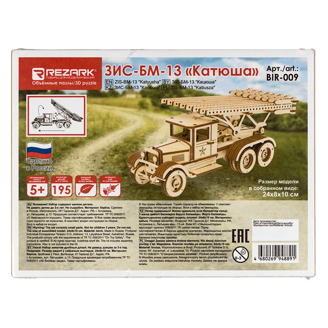 Детский развивающий пазл Rezark ЗИС-БМ-13 «Катюша» представляет собой небольшую сборную 3D модель из плоских фанерных деталей.