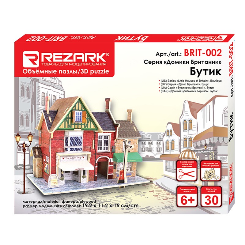 Детский развивающий пазл Rezark серии Домики Британии «Бутик» представляет собой сборную 3D модель из плоских фанерных деталей с цветными картинками на них.