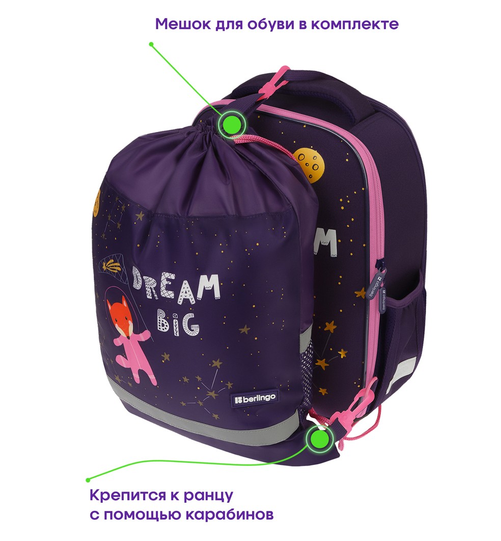 В комплекте идет мешок для обуви с креплением к ранцу с помощью специальных фиксаторов.