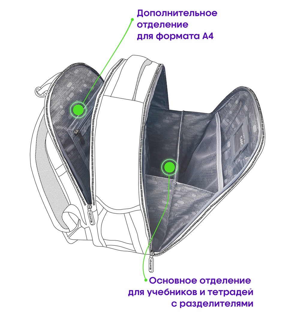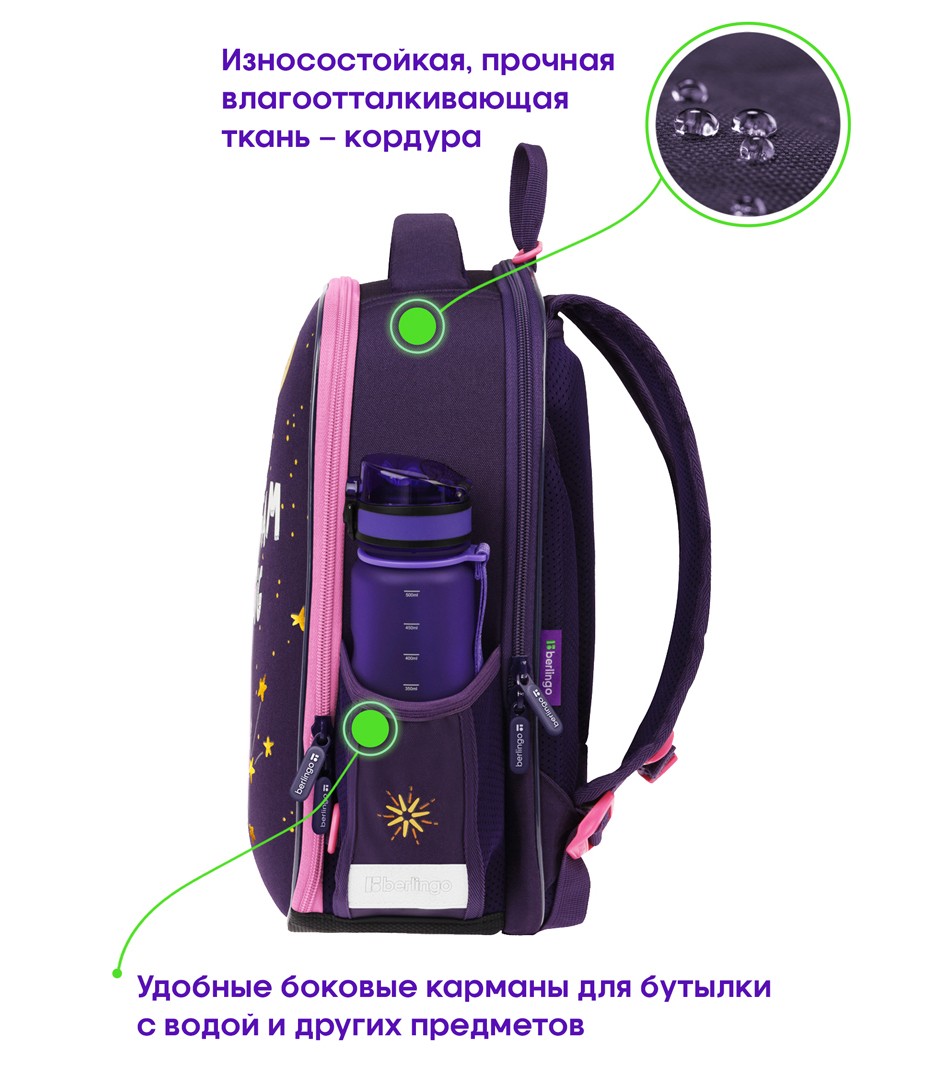 Уплотненная мягкая ручка и петля для подвешивания к парте, дно из водонепроницаемого материала с пластиковыми ножками, световозвращающие элементы на лямках, передней и боковых частях ранца — для безопасности ребенка в темное время суток.