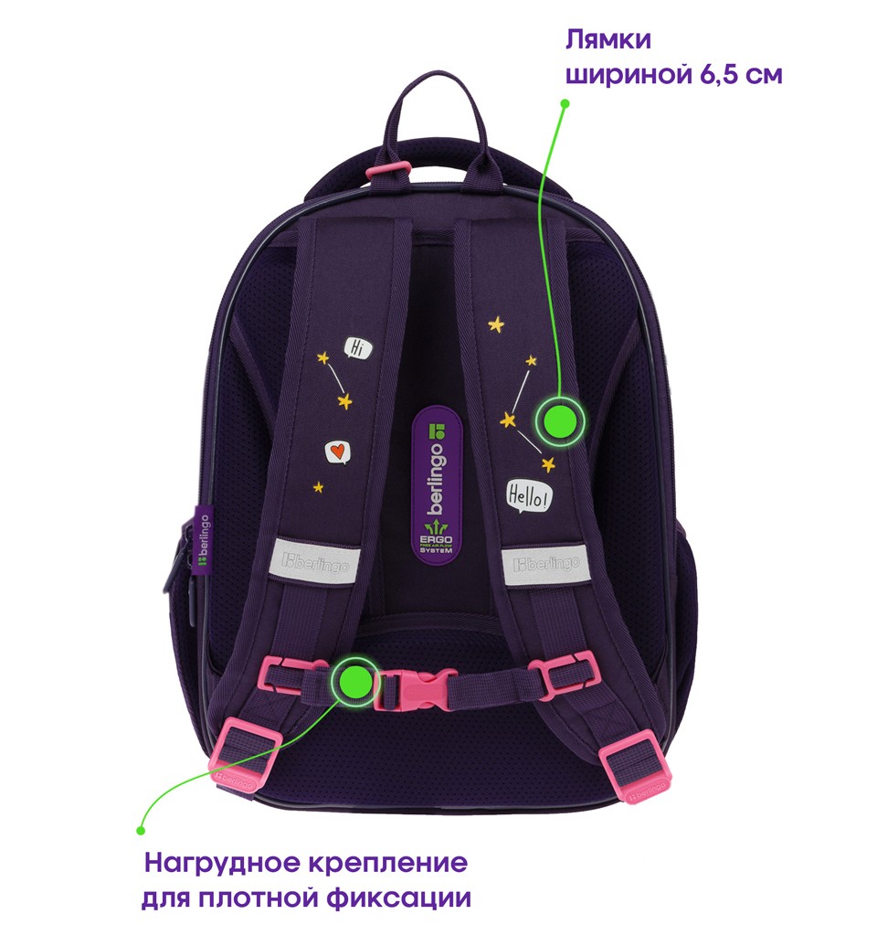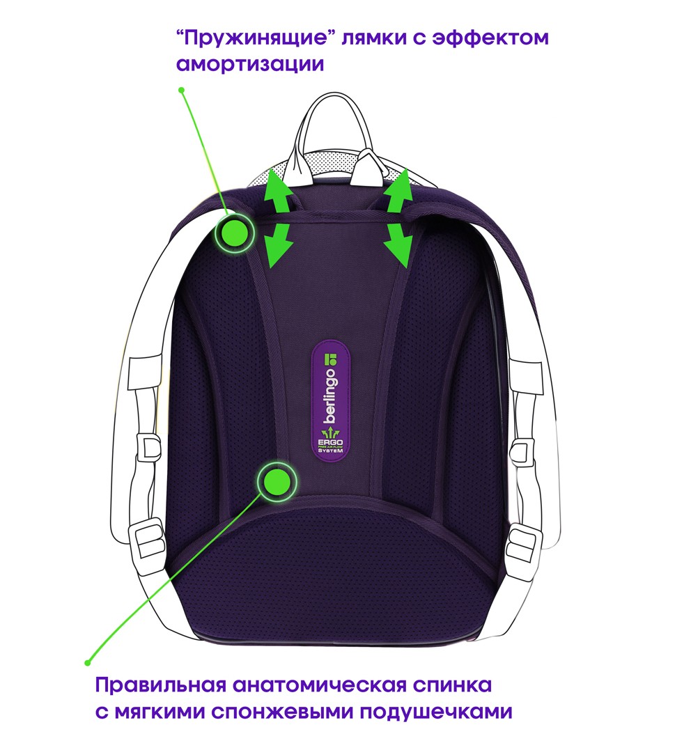 Благодаря анатомической вентилируемой спинке, регулируемым по длине и высоте лямкам, а также нагрудному креплению ранец плотно фиксируется на спине ребенка, что помогает равномерно распределить нагрузку и сохранить правильную осанку.