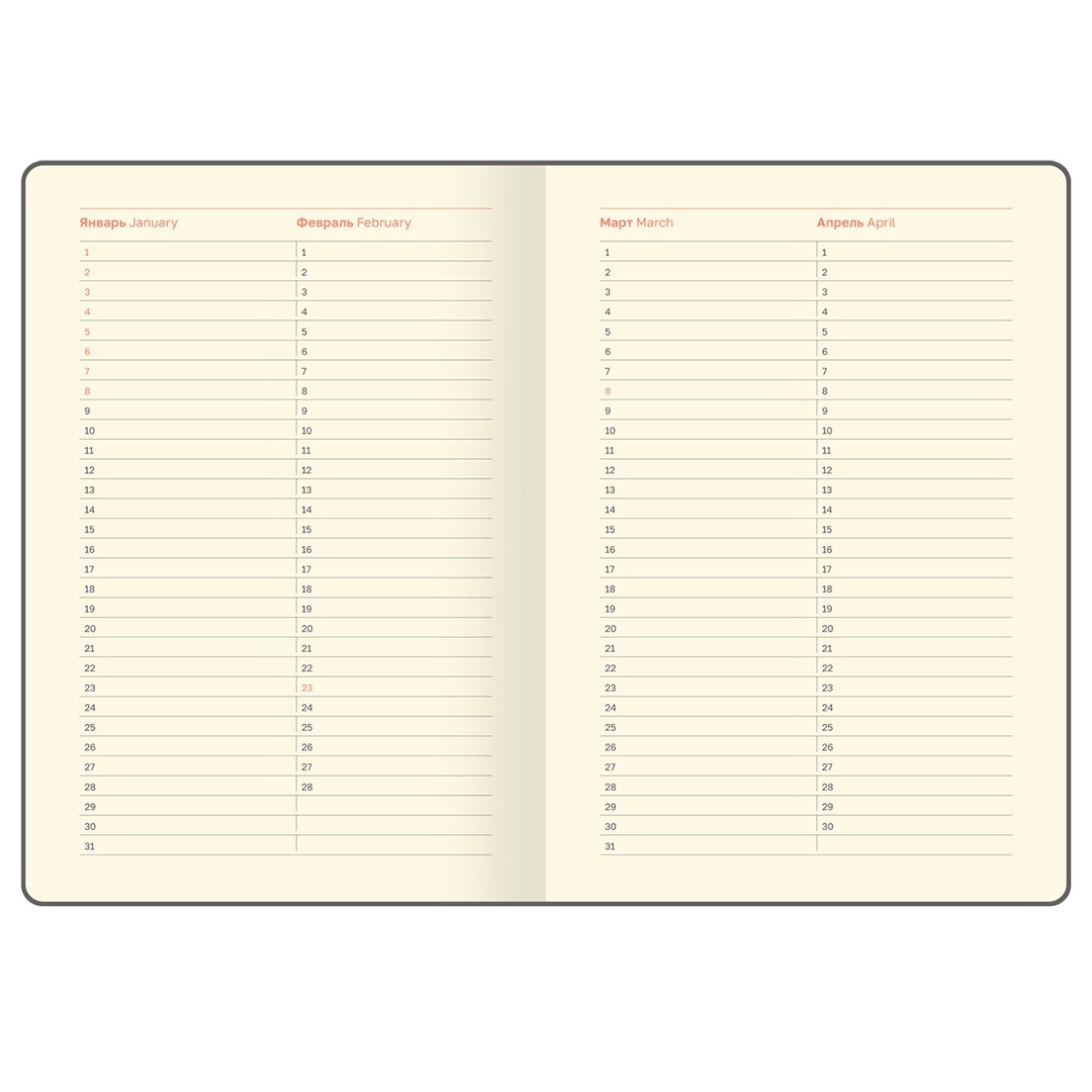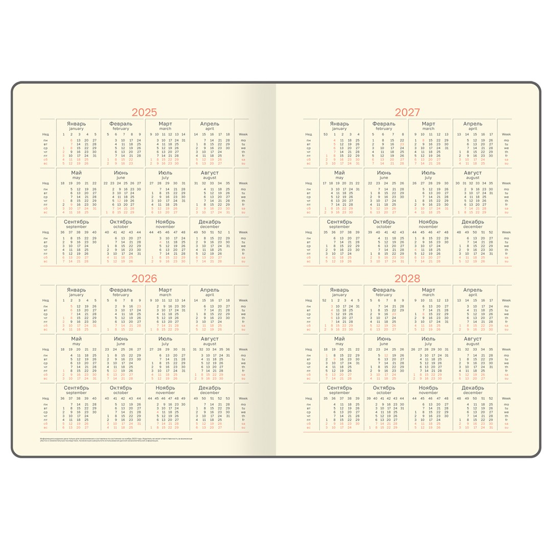 Содержит календарь на 4 года, листы для записи контактов, заметок и зарисовок.