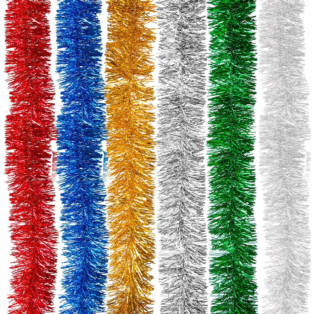 В наличии есть мишура следующих цветов: серебристого, белого, зеленого, золотистого, красного, синего.
