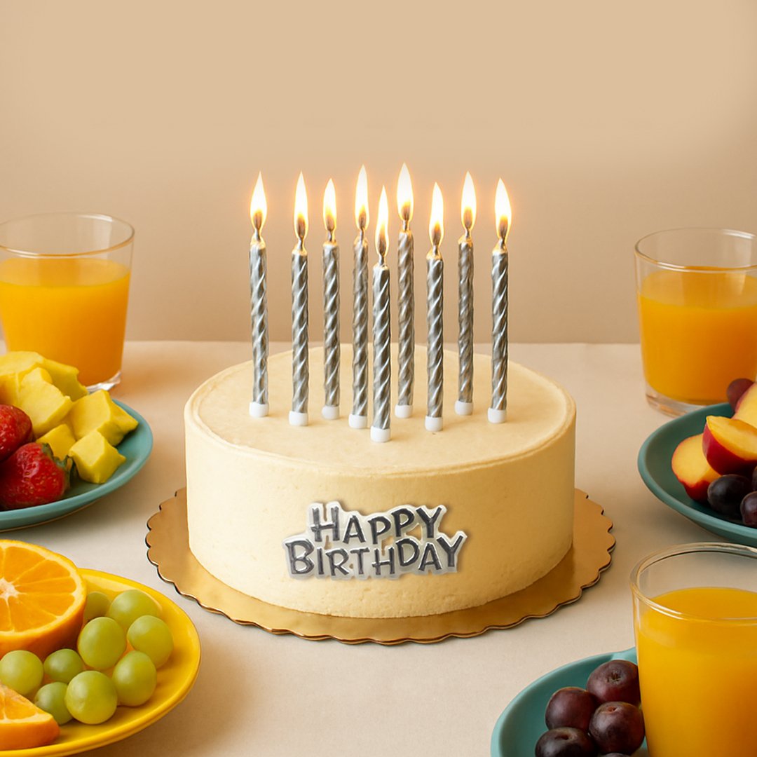 В комплект входят 12 изысканных свечей для торта и декоративная табличка с надписью «Happy Birthday». Каждая свеча снабжена удобным пластиковым держателем, который обеспечивает лёгкую и надёжную установку на поверхности торта.