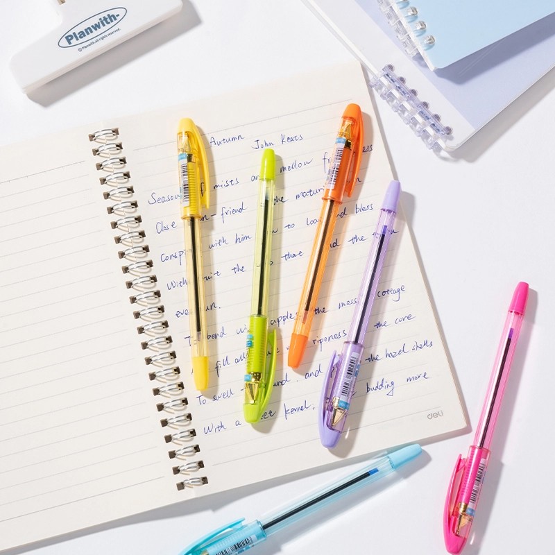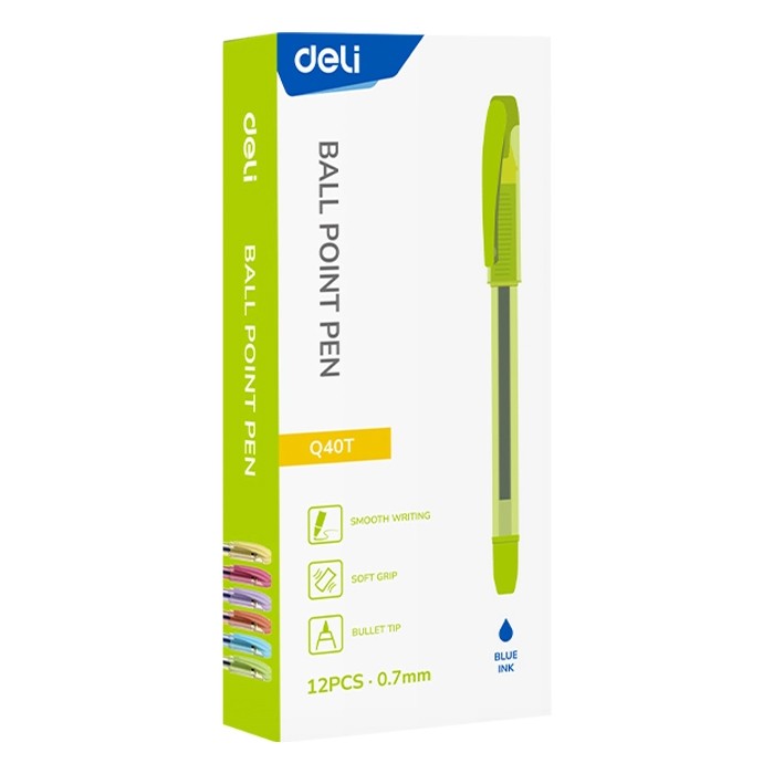 Шариковая ручка Deli в прозрачном пластиковом корпусе, с синими чернилами на масляной основе для мягкого, скользящего письма, с прорезиненной областью захвата.