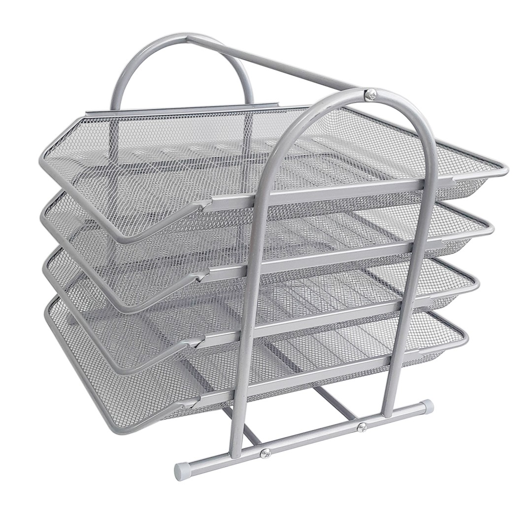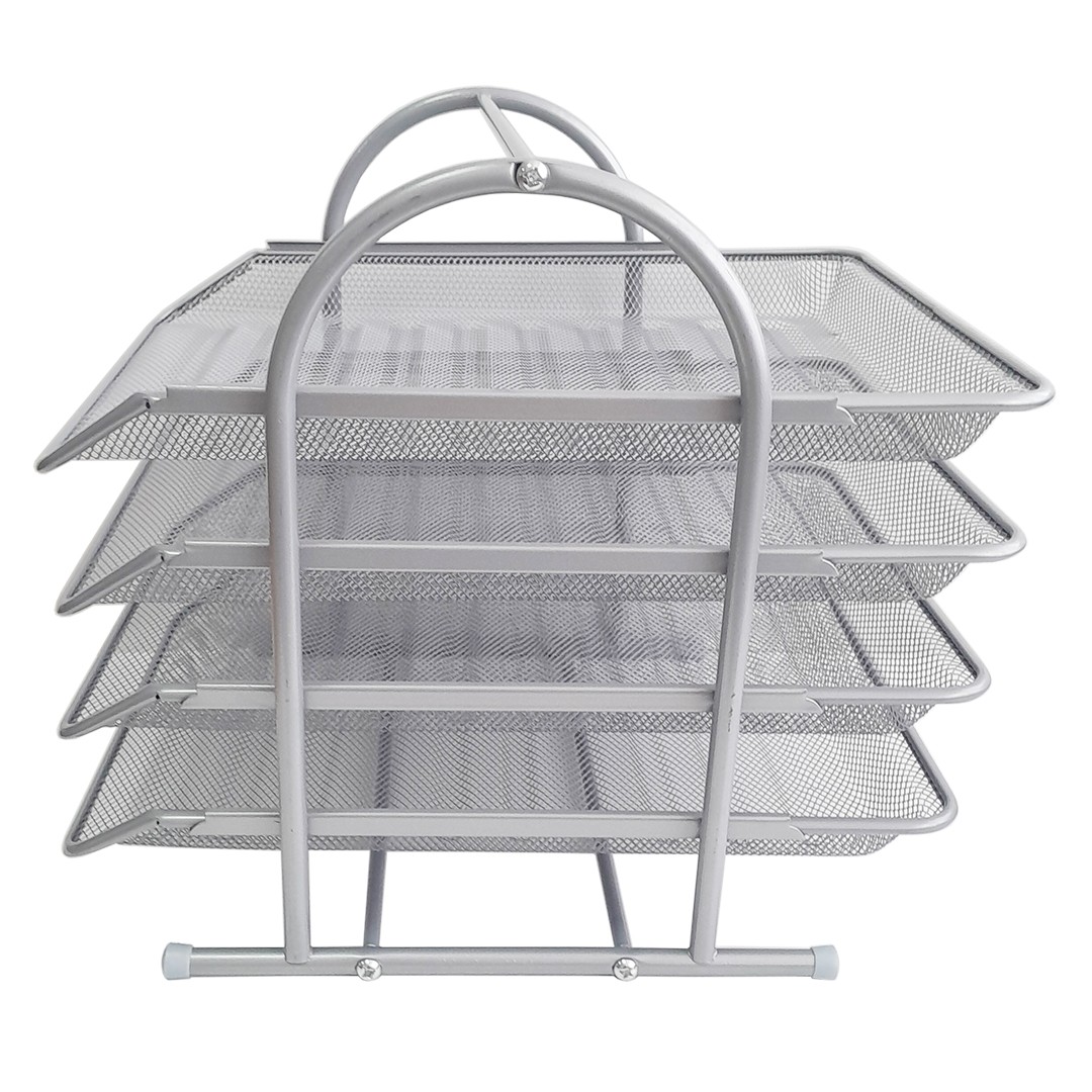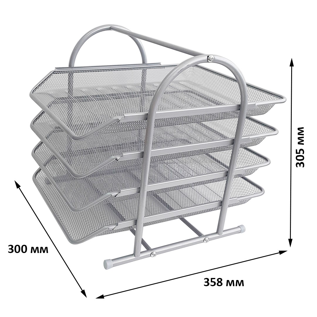 Горизонтальный, металлический, серебряный лоток, на 4 выдвижные секции, предназначен для удобства хранения на рабочем столе журналов, проспектов, каталогов формата А4.