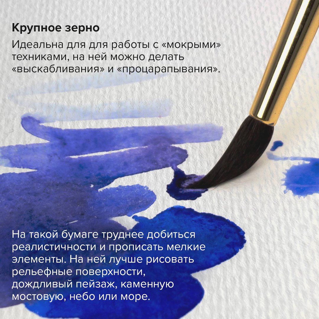 Бумага с крупным зерном идеально подходит как для техники по-сырому, так и для классической акварели. При работе цвета остаются яркими и выразительными, а поверхность устойчива к стиранию и скоблению. Благодаря отсутствию кислот, ваши произведения сохранят свежесть и насыщенность на долгие годы.