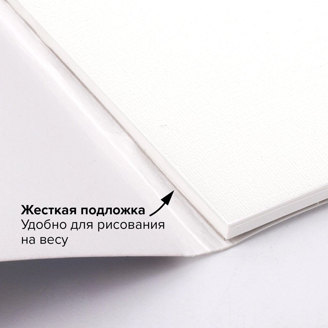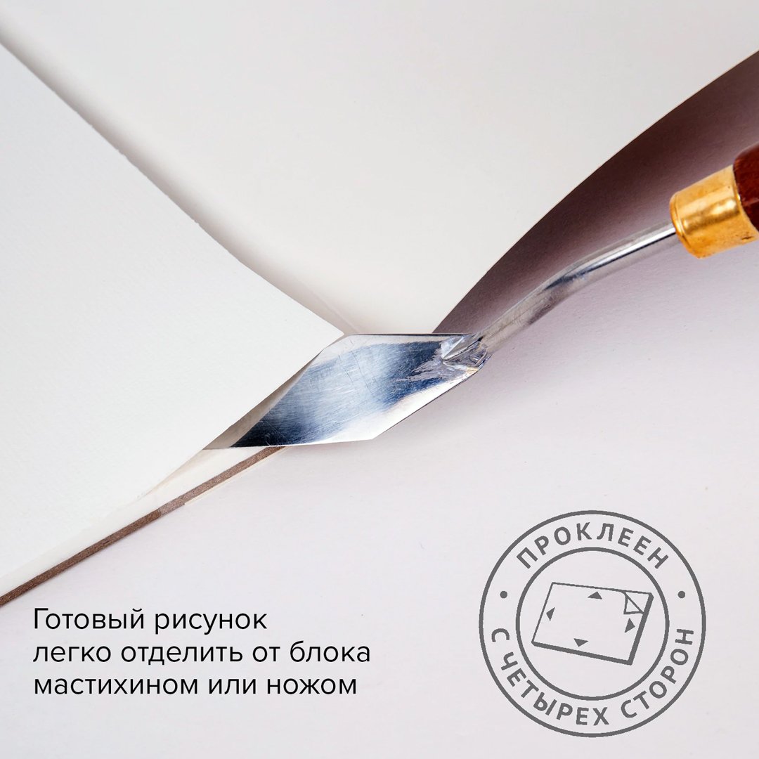 Блок проклеен с 4-х сторон, благодаря чему листы надёжно зафиксированы во время работы. Для удобного отделения готовой работы предусмотрен непроклеенный уголок — лист легко отделяется канцелярским ножом или мастихином. Встроенная жесткая подложка гарантирует ровную и устойчивую поверхность, даже вне студии.