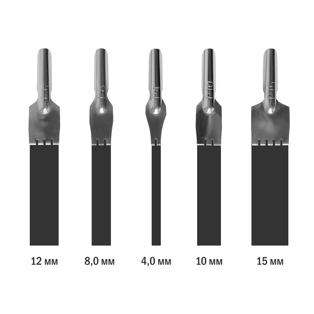 В комплект входят 5 стальных перьев разных размеров: 4, 8, 10, 12 и 15 мм, что позволяет варьировать толщину линии письма от 4 до 15 мм в зависимости от нажима и стиля.
