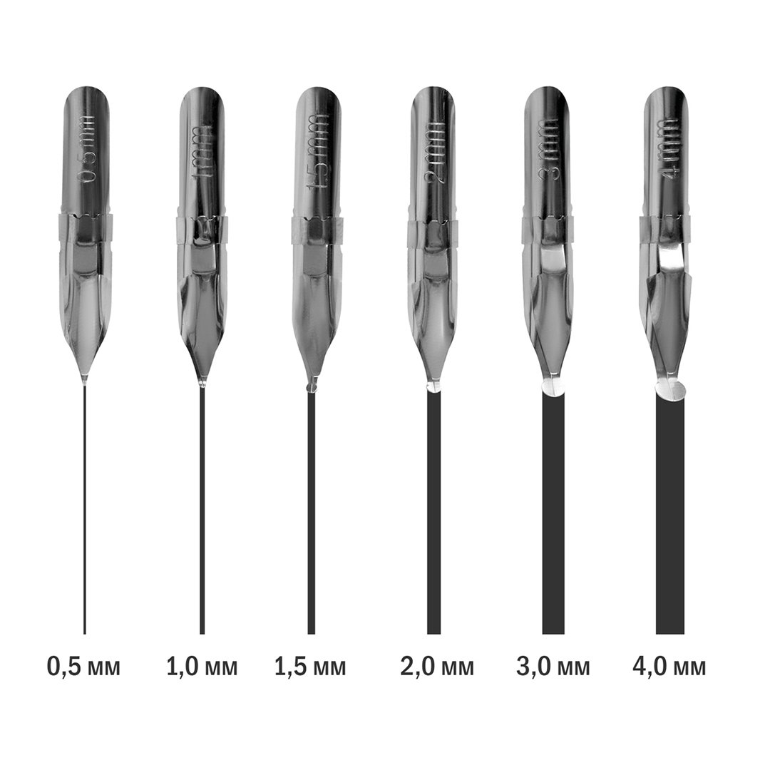 В комплект входят 6 стальных перьев разных размеров: 0,5; 1; 1,5; 2; 3; 4 мм, что позволяет создавать линии толщиной от 0,5 до 4 мм в любом направлении благодаря верхнему резервуару и круглому наконечнику.