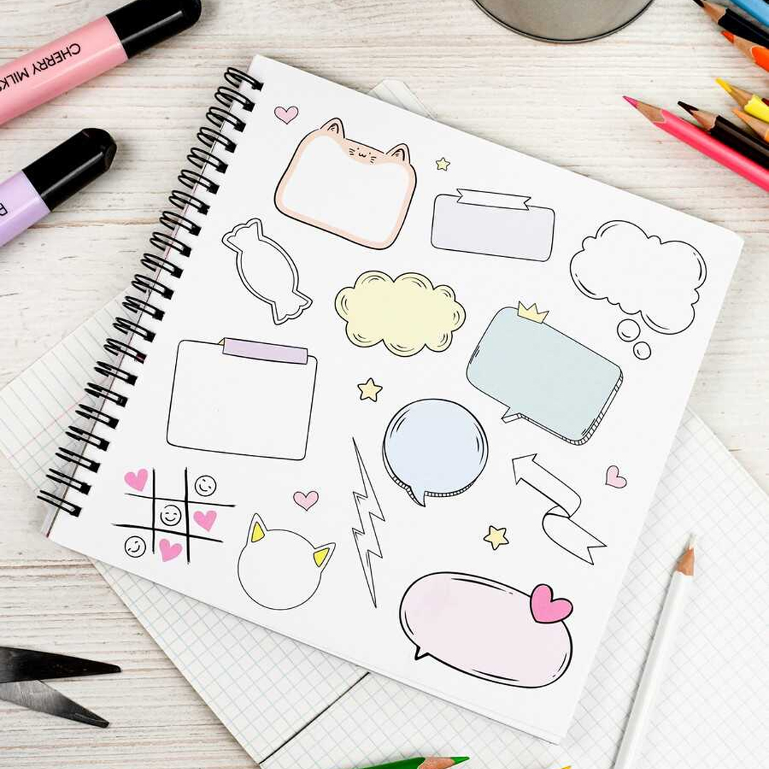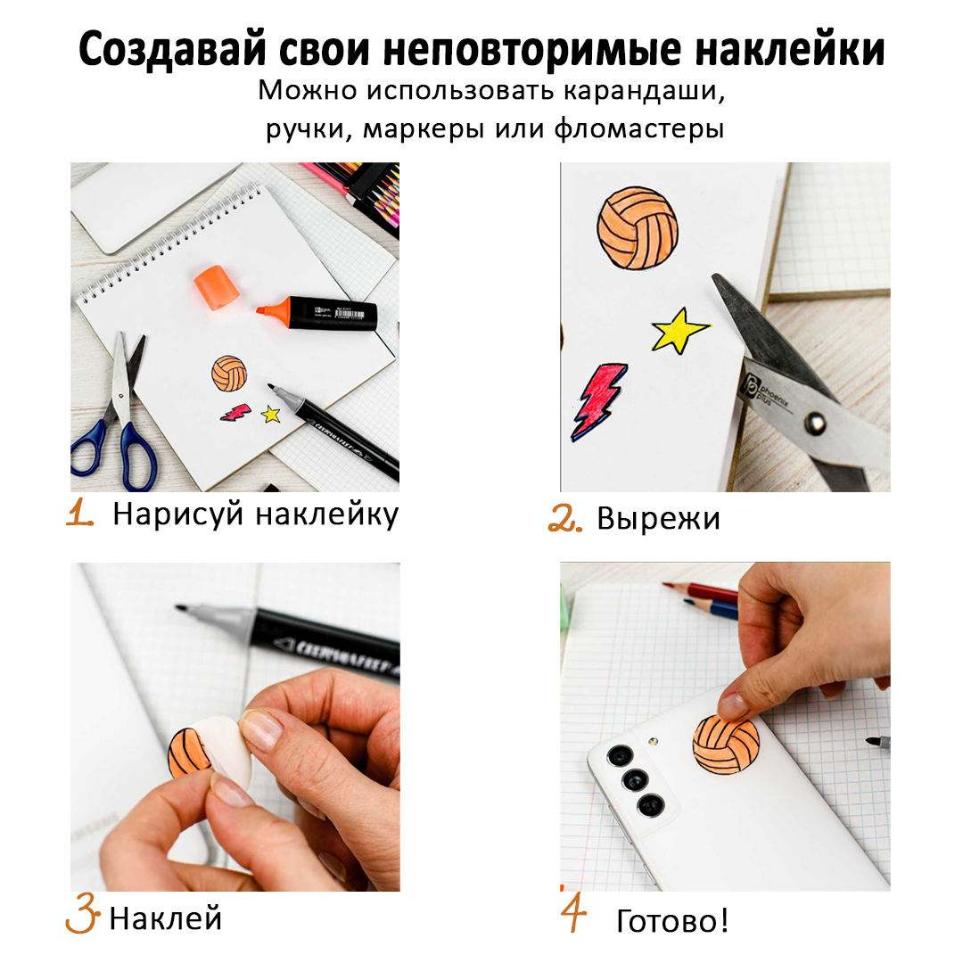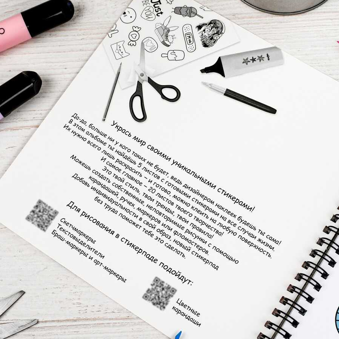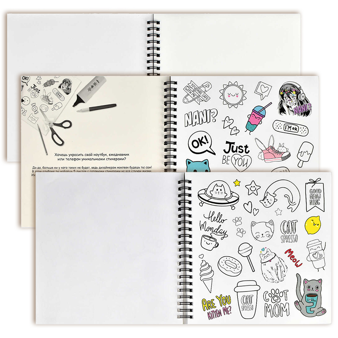 Внутренний блок включает 25 листов, из которых 5 листов уже содержат готовые стикеры, а 20 листов — чистые, предназначенные для самостоятельного рисования. Создавать свои наклейки можно с помощью карандашей, ручек, маркеров и фломастеров.