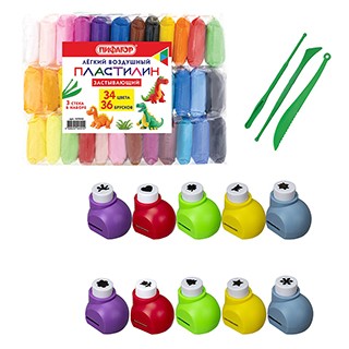 Яркие новинки для детского творчества — набор воздушного, застывающего пластилина (36 брусков) и фигурные дыроколы (12 видов ассорти).